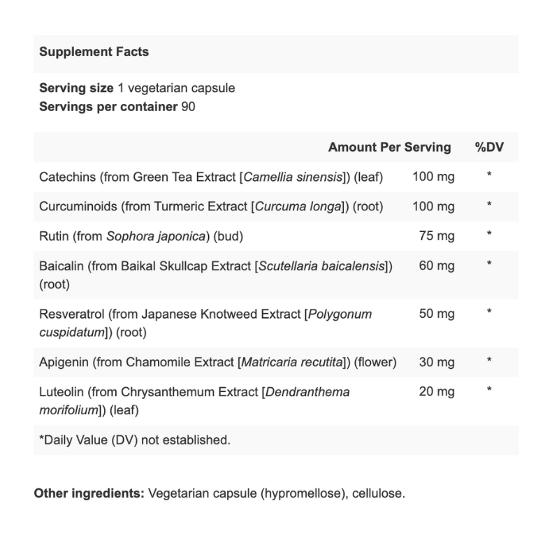 Flam Calm is a phenol-flavonoid complex designed to specifically target brain health as it relates to microglial activity (in the brain-immune system) and the associated oxidative stress.* The brain-immune system plays a key role in maintaining the cellular environment in the central nervous system.* Key ingredients include catechins, curcuminoids, baicalin, and apigenin.