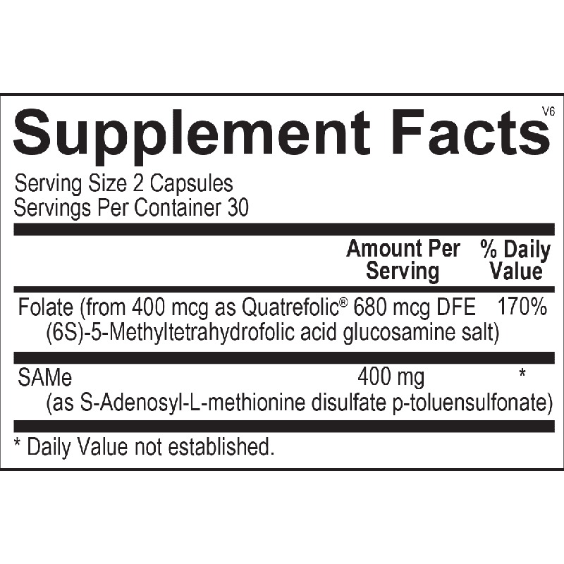S-Adenosylmethionine (SAMe) is the active methyl form of the amino acid methionine. SAMe is necessary for an array of biochemical pathways, including neurotransmitter synthesis, metabolism of homocysteine, and detoxification. As a donator of methyl groups, SAMe supports glutathione production, liver health, musculoskeletal and joint comfort, and a positive mood.