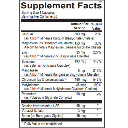- Includes calcium, magnesium, zinc, selenium, manganese, chromium, molybdenum, potassium, boron and vanadium in their most bioavailable chelated forms.