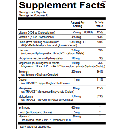 This formula is further fortified with boron to promote skeletal strength, manganese as a cofactor in bone formation, copper and molybdenum for collagen cross-linking, and selenium to protect bone cells against oxidative stress.