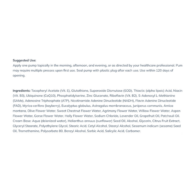 Product Tags: topical antioxidant cream, glutathione cream, superoxide dismutase cream, alpha lipoic acid cream, CoQ10 cream, SAMe cream, vitamin B2 cream, vitamin B3 cream, cellular health support, oxidative stress relief
