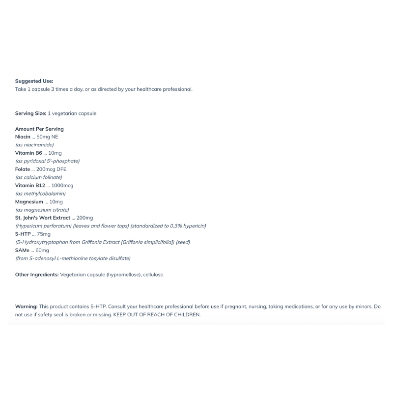 Sero-Tonic helps to support the serotonergic system using nutrients, targeted amino acids, and cofactors.* This formula includes high-potency vitamin B12 (1000 mcg per serving), vitamin B6, and niacin, and it is an excellent source of folate. Key ingredients include SAMe, 5-HTP, and high-quality, standardized St. John's wort extract.