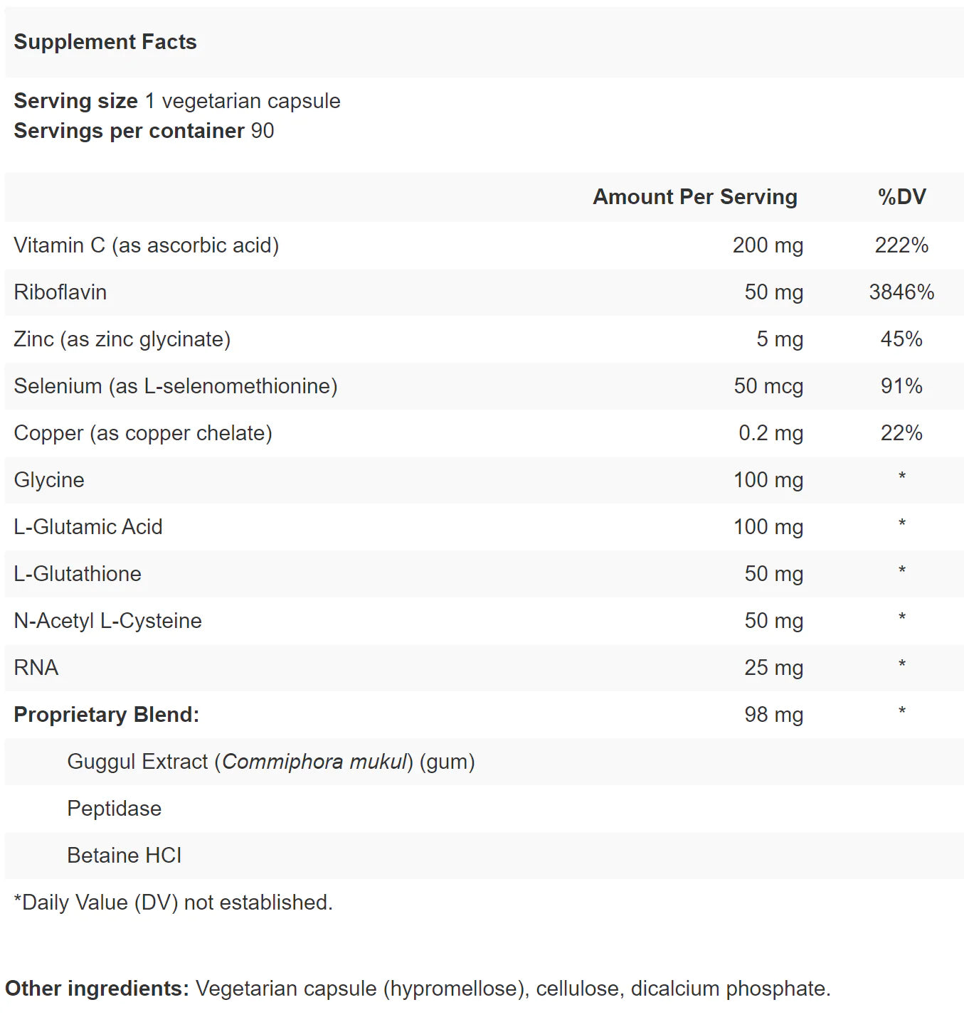 Thyro-Support is intended to support intracellular enzymatic processes by providing targeted phytonutrients and amino acids.* It also includes key minerals and vitamins that help support the endocrine system, as it relates to the thyroid.* This formula contains high-potency riboflavin and antioxidant vitamin C. It is also an excellent source of zinc, copper, and selenium.