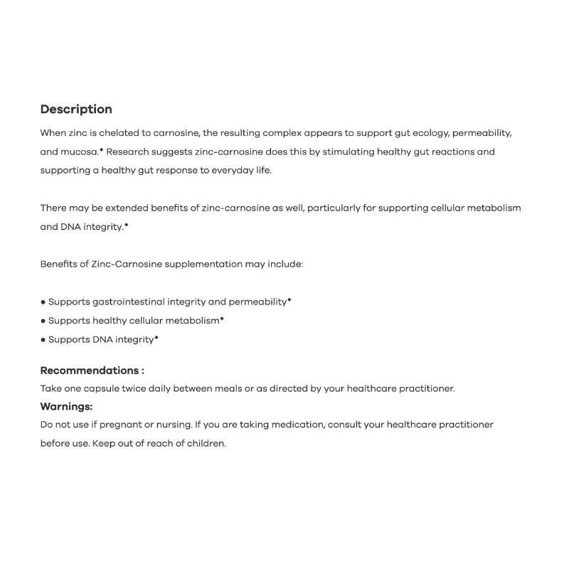 When zinc is chelated to carnosine, the resulting complex appears to support gut ecology, permeability, and mucosa.◆ Research suggests zinc-carnosine does this by stimulating healthy gut reactions and supporting a healthy gut response to everyday life.